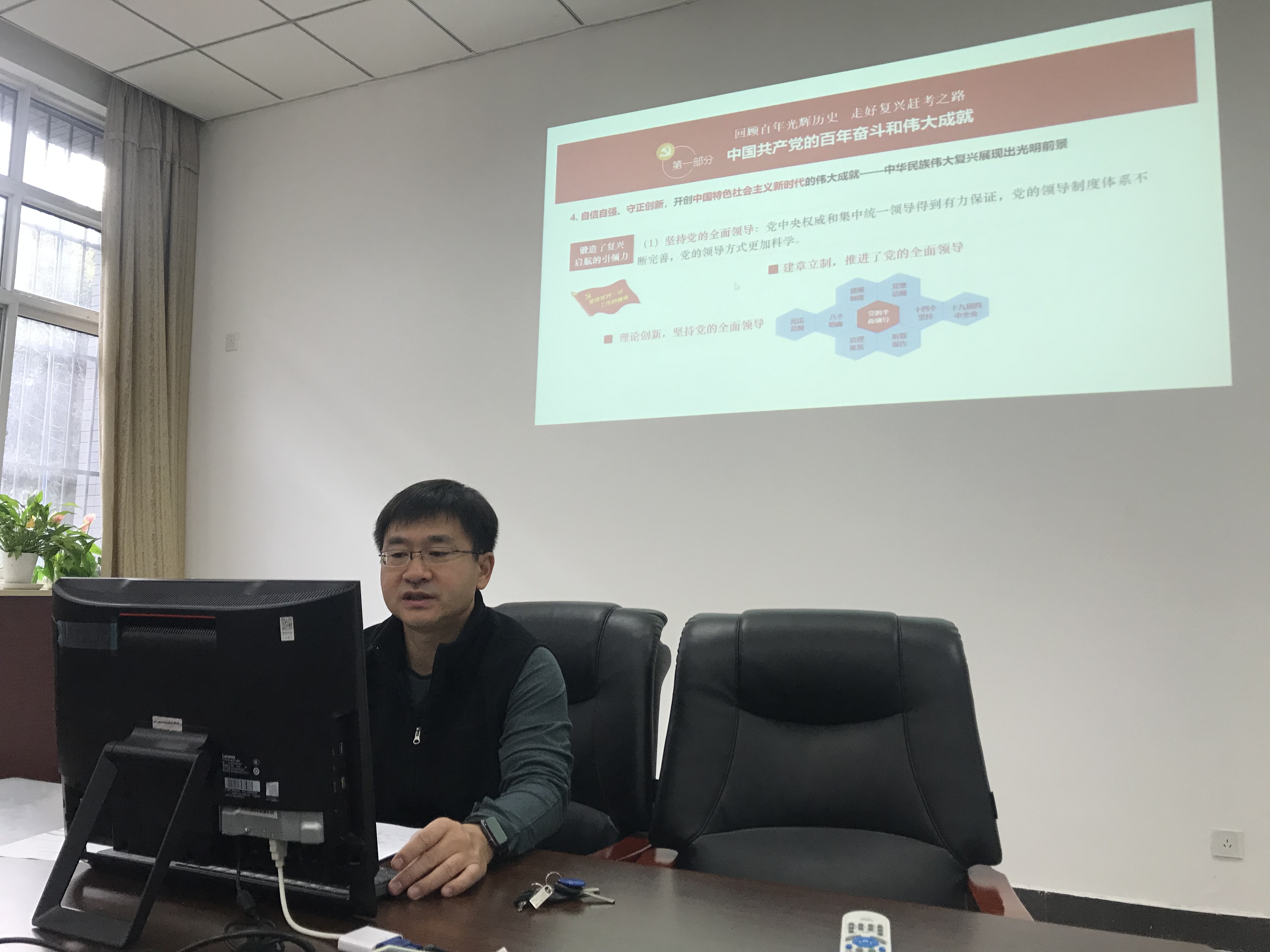 12月17日下午,电子信息学院党委理论学习中心组贯彻落实党的十九届六中全会精神第三次专题学习研讨会在学院119会议室召开。学院党委书记侯俊同志为全体中心组成员讲授“回顾百年光辉历史,走好复兴赶考之路”专题党课,宣讲党的十九届六中全会精神。
