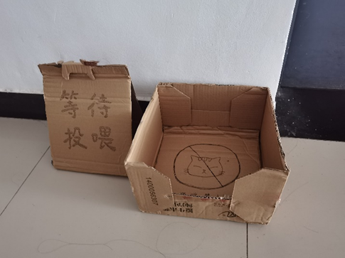 同学们在宿舍门口也放了自己用心制作用来放饭菜的纸箱,并每天分享自己的饭菜盲盒对志愿者和工作人员表达感谢,同时还有每天志愿者送饭时收获的每位同学的“谢谢”和“辛苦了”让志愿者的心中倍感宽慰。