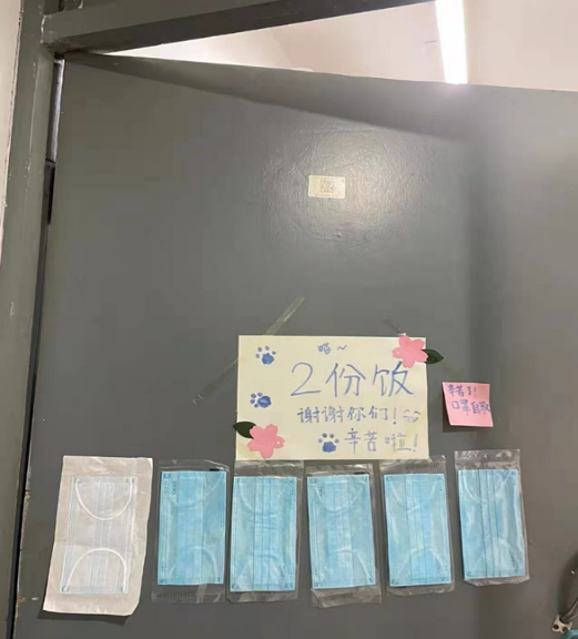同学们都在自己的宿舍门贴上了温暖的小纸条,写上了所需要的饭菜数量,并且不约而同的表达了对送餐志愿者的谢意,有的画上了可爱的图案来表达感恩,让志愿者可以在重复且劳累的搬运中感到一点点快乐,有的同学不太会画画,简单的语言也让志愿者感到了同学们真诚的谢意,还有同学细心的在门口贴上了口罩,供志愿者方便使用。