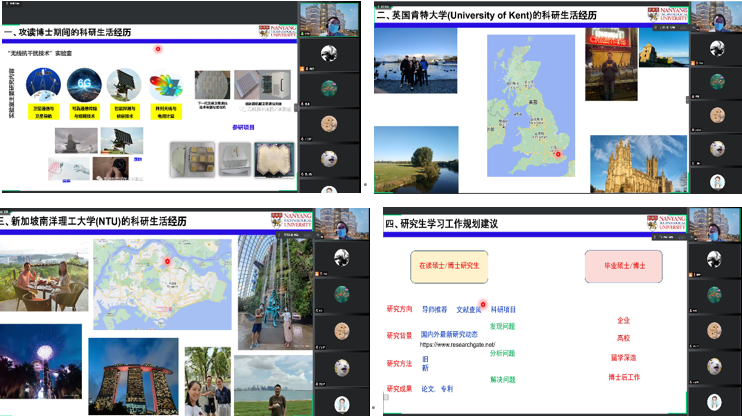 徐瑞以时间轴为顺序,分别讲述了在西北工业大学攻读博士期间以及在英国肯特大学和新加坡南洋理工大学做海外博士后期间的科研、生活、学习及成长经历,并结合自己的求学、求职的相关经验和心路历程,向大家分享了自己在职业发展等方面的经验,给了同学们很多科研和职业规划上的建议,与会同学们受益良多。