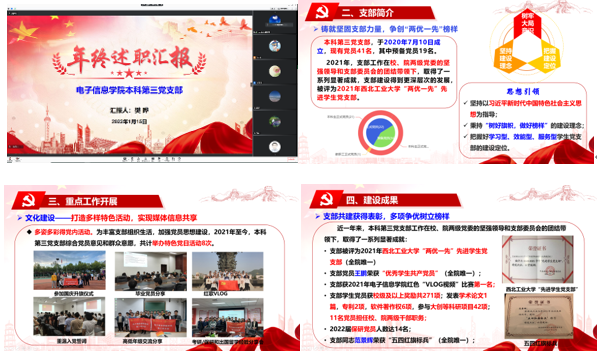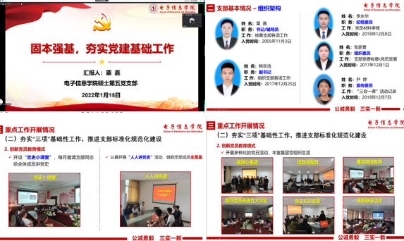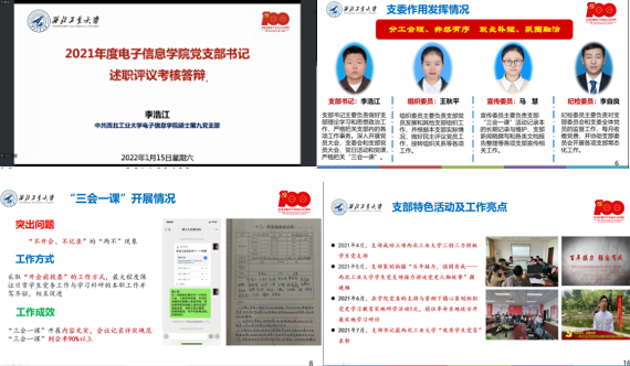 为深入学习贯彻习近平新时代中国特色社会主义思想和党的十九大和十九届二中、三中、四中、五中、六中全会精神,认真落实全面从严治党工作要求,切实提升党建工作质量,根据学校《关于开展2021年度党支部书记抓党建工作述职评议考核的通知》要求,1月15日下午,电子信息学院党委以线上形式召开“2021年度学生党支部书记抓党建工作述职评议考核大会”。电子信息学院党委书记侯俊、院长王伶、管理学院党委副书记王兆旭、电子信息学院领导班子成员及党委委员、学生处张文静老师、教师代表和学生支部书记参加本次会议,会议由党建秘书闻梦宇主持。