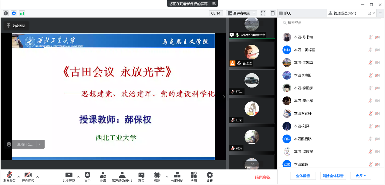 为深入学习贯彻习近平总书记在党史学习教育动员大会上重要讲话精神,根据中共中央办公厅《关于推动党史学习教育常态化长效化的意见》文件精神,3月25日下午,电子信息学院邀请陕西省政党治理与意识形态安全中心主任、学校马克思主义学院教授郝保权老师做题为“古田会议永放光芒”的党史学习教育专题线上培训活动。学院党委书记、教师党支部、学生党支部、班主任、辅导员及办公室人员参加了此次培训活动,活动由学院党委副书记彭亮主持。