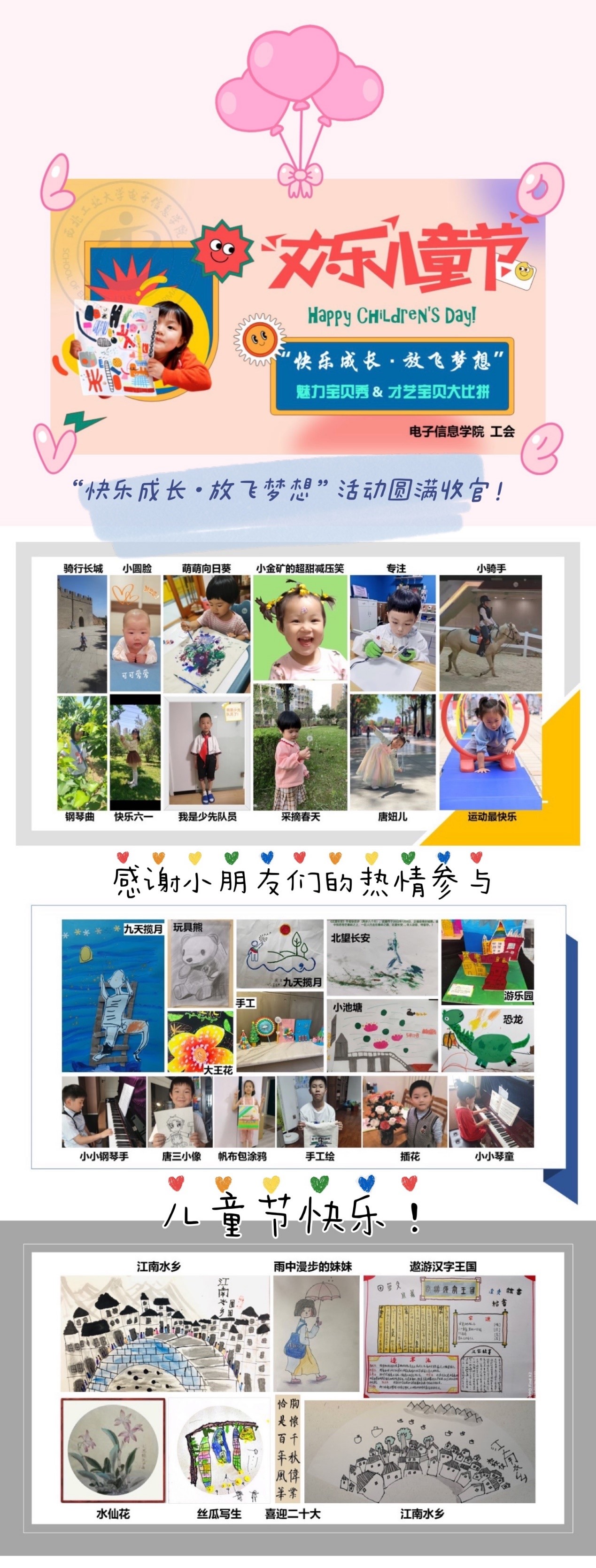 在“六一”国际儿童节来临之际,5月27日至30日,电子信息学院工会组织举办“快乐成长·放飞梦想”六一风采展示活动。活动主要包括“魅力宝贝秀”与“才艺宝贝大比拼”两种形式,小朋友们可以在镜头前展示自己的“才华”(萌态、乐器等),也可以提交自己的“杰作”(绘画、书法、手工等)。活动受到了小朋友们的热烈响应,他们通过书画、演奏、手工、运动等多种形式展示了他们的奇妙世界。