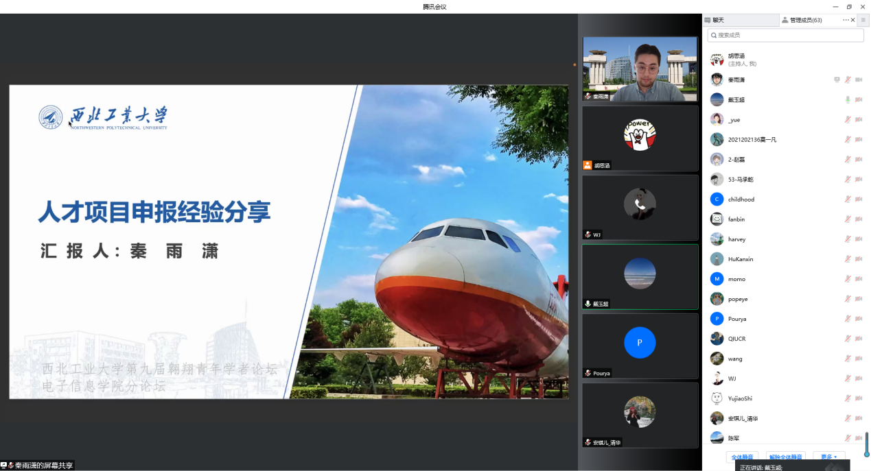 6月2日下午,西北工业大学第九届翱翔青年学者论坛电子信息分论坛成功举办。受疫情影响,此次分论坛采用线上形式举办,邀请来自美国、英国、澳大利亚、德国、沙特等地的10位青年学者做了学术交流报告。海内外青年学者、学院学术委员会委员、科研团队负责人、学院师生等百余人参加了此次分论坛,分论坛由电子信息学院院长助理戴玉超教授主持。