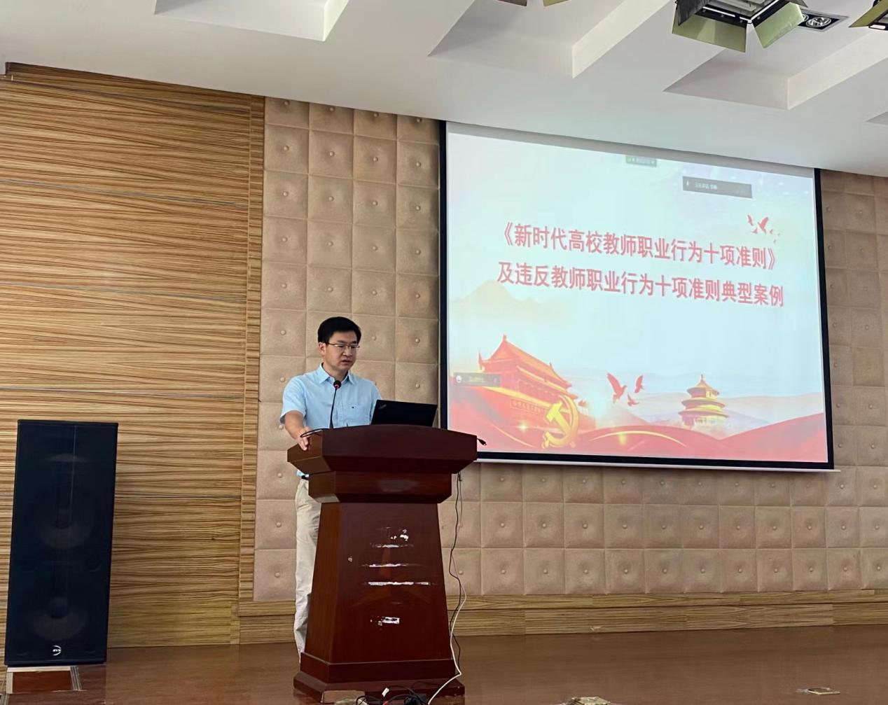 随后,开展了教师队伍建设与师德师风建设等相关文件精神的培训。侯俊讲解了《新时代高校教师职业行为十项准则》,通报了教育部近期公布的违反教师职业行为十项准则典型案例,以案示警,强调进一步压实工作责任,加强师德师风建设,引导学院教职工做到自警、自醒。