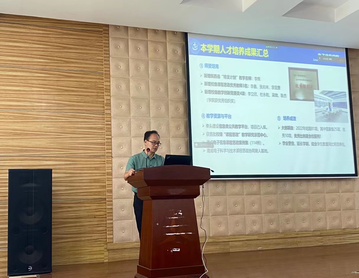 6月23日上午,电子信息学院在长安校区8、9院报告厅召开了学期末全院大会,学院领导班子以及教师代表共50人线下参会,其余教职工线上参加了此次大会。会议由党委书记侯俊主持。