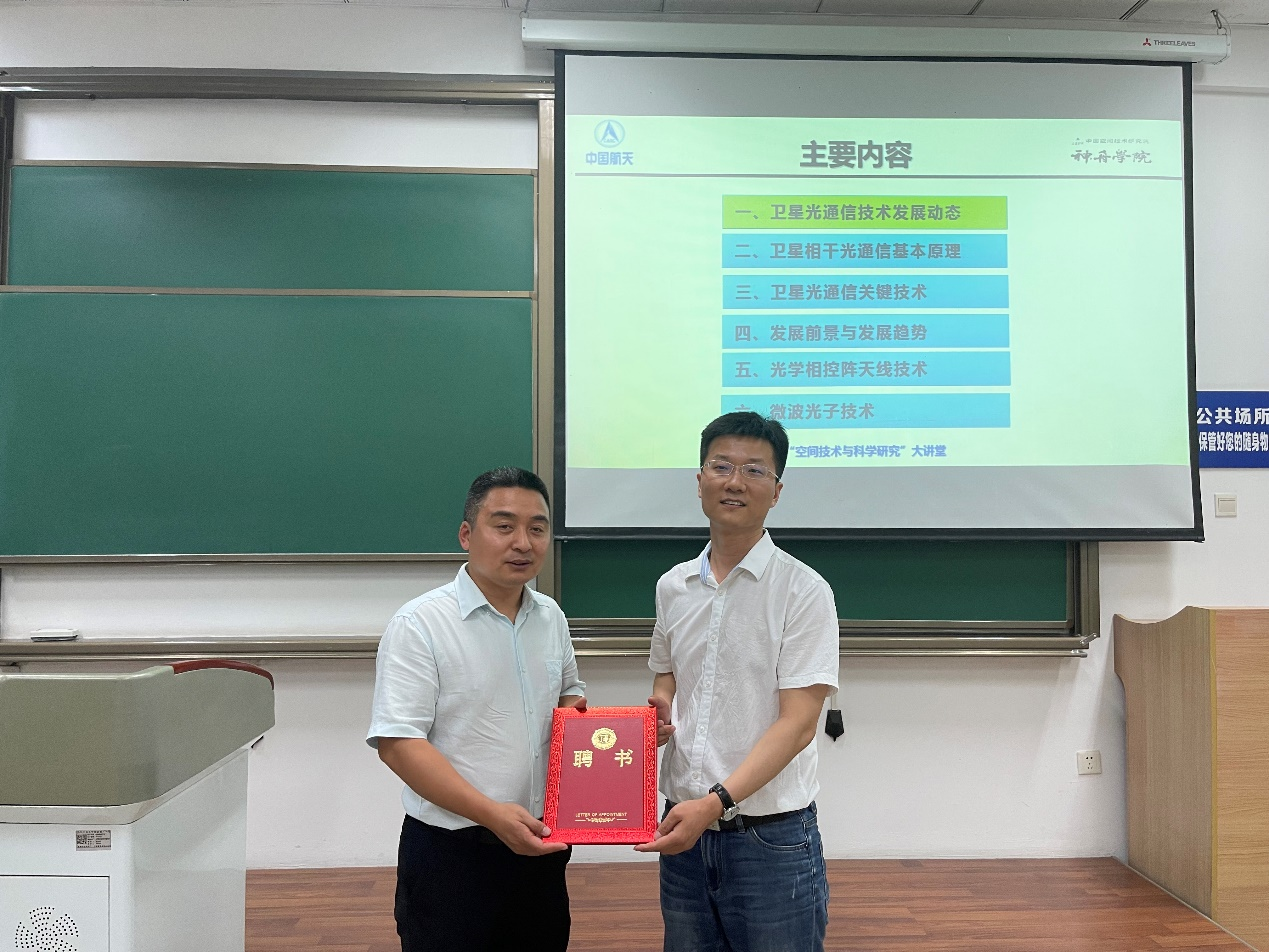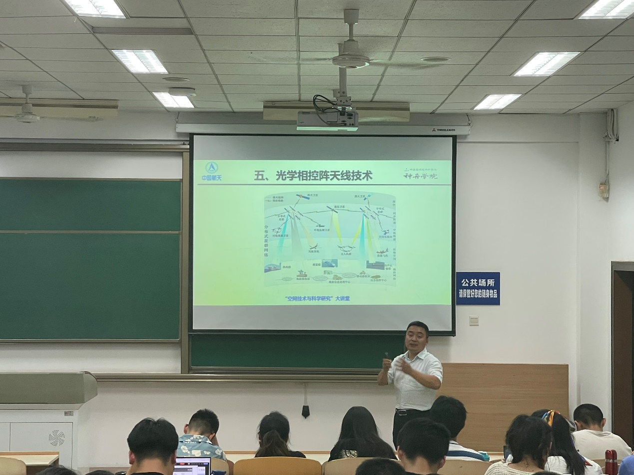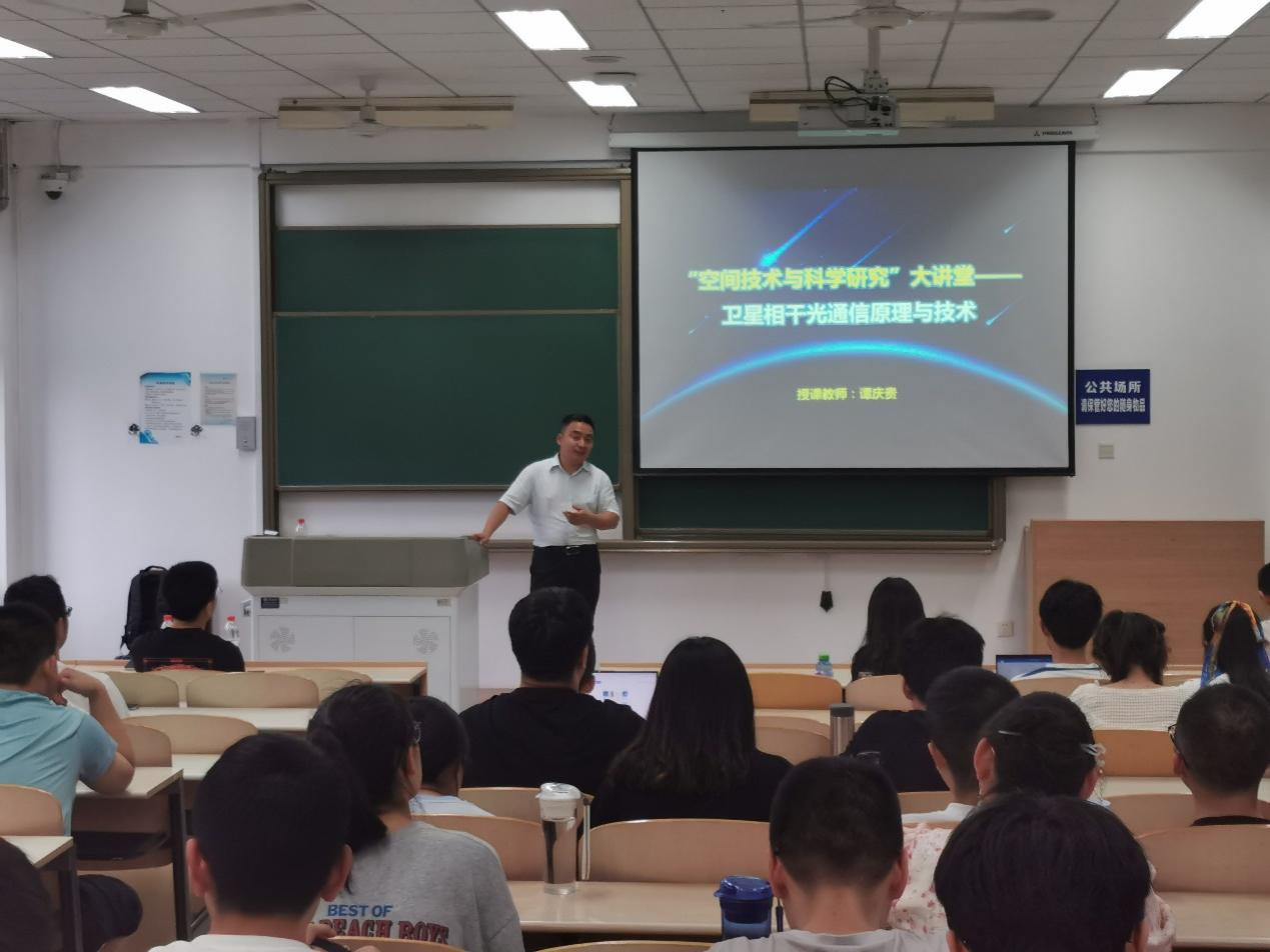 6月2日晚,电子信息学院专业课《光电技术》课堂请来了一位特殊的老师——西安空间无线电技术研究所(航天五院西安分院)研究员谭庆贵博士。他为该课程的50余名本科生讲授了“卫星相干光通信原理”课程内容。《光电技术》课程主讲教师高永胜副教授、翟伟乐副教授参加了本次授课活动。