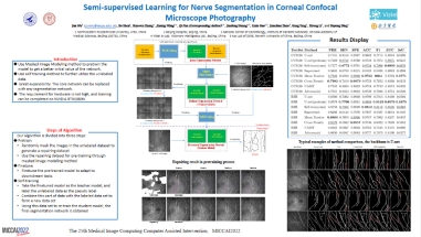 吴俊老师和沈博同学等合作发表的论文Semi-supervised Learning for Nerve Segmentation in Corneal Confocal Microscope Photography被MICCAI主会录用,该论文提出了一种可以用于角膜共聚焦显微图像分割的半监督学习框架,充分利用了无标签的图像数据、对标注数据的要求显著降低,使得该方法在实际临床应用中具有很大的潜力。该方法已经申请了国家发明专利。