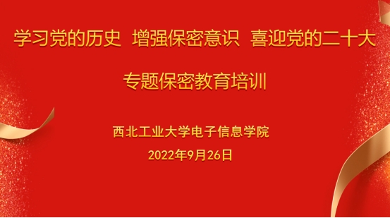 为持续推进党史教育常态化、长效化,弘扬以伟大建党精神为源头的保密人员的精神谱系,增强保密防范意识,9月26日下午,在电子信息学院119会议室,召开“学习党的历史,增强保密意识,喜迎党的二十大”为主题的培训会。本次培训会特邀西安市委宣传部理论处处长贾双红授课,学院党委书记侯俊、院长王伶、学院各教师党支部委员和新入职青年教师参加了培训会。会议由王伶主持。