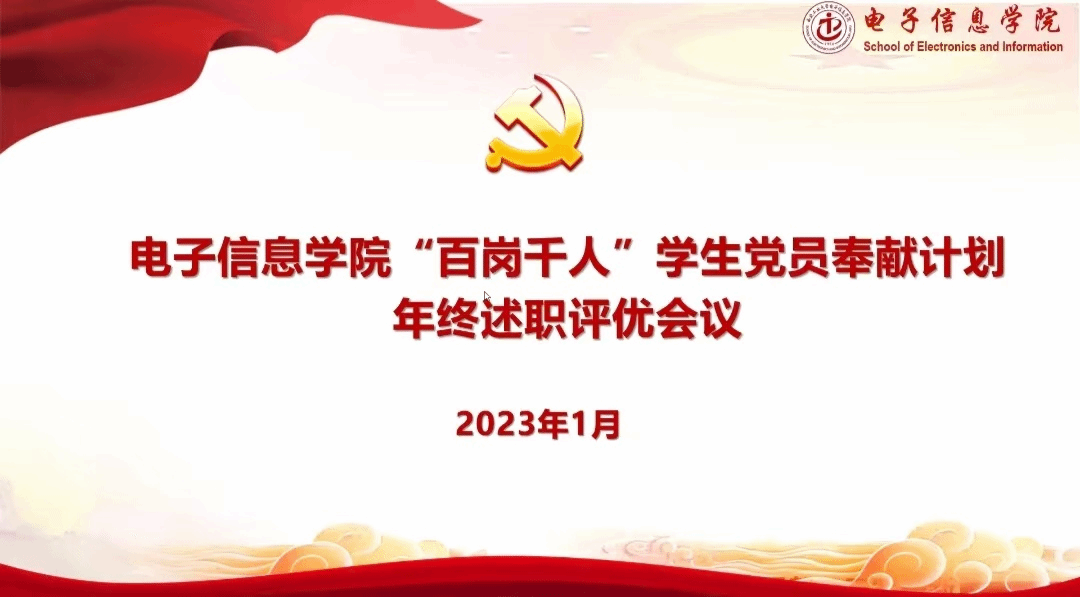 1月12日下午,电子信息学院于线上召开“百岗千人”学生党员奉献计划年终述职评优会议,组织评选“百岗千人”年度学生党员先锋岗。