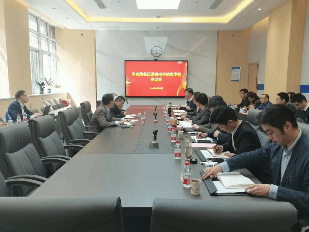 3月28日上午,学校党委书记李言荣到电子信息学院调研指导工作,学院领导班子成员、院长助理、各系主任以及教师代表参加了此次座谈会,会议由党委书记侯俊主持。