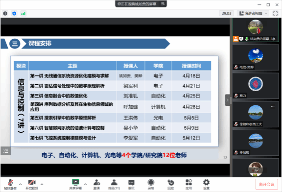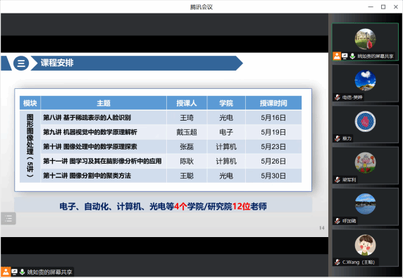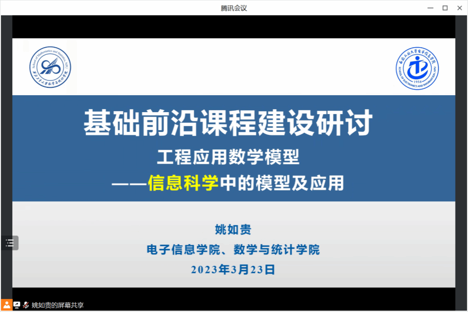 3月23日,电子信息学院与数学与统计学院联合召开基础前沿课程《工程应用数学模型——信息科学中的模型及应用》建设研讨会议。数学类基础交叉前沿课程负责人、《工程应用数学模型》课程群负责人、《工程应用数学模型——信息科学中的模型及应用》课程负责人及授课教师等参加了会议。会议由电子信息学院副院长姚如贵主持。