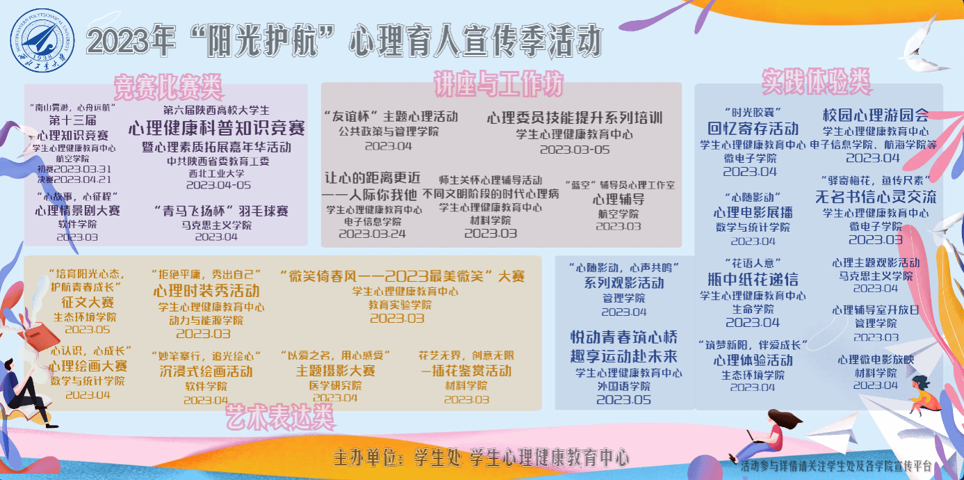 本届西北工业大学“阳光护航”心理育人宣传季活动自3月起持续至5月底,期间将围绕心理主题开展竞赛比赛类、艺术表达类、实践体验类以及讲座与工作坊活动,旨在为同学们搭建锻炼心理健康素质、提高心理承受能力、促进心理品质改善的平台,提升同学们维护自身心理健康的意识,营造良好的心理健康教育校园氛围。电子信息学院圆满承办了此次心理育人宣传季的启动仪式,后续还将承办校园心理游园会,期待同学们的参与!