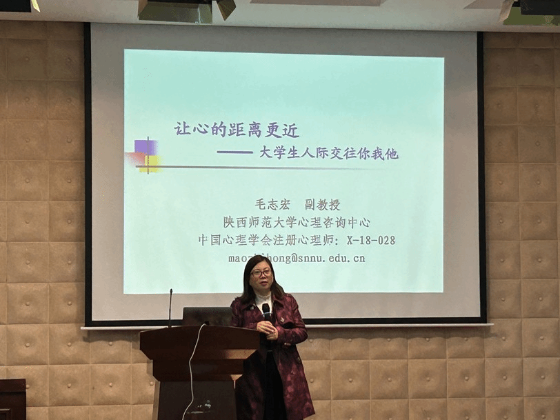 启动仪式的最后,由陕西师范大学心理健康教育指导中心的毛志宏老师,为同学们带来《让心的距离更近——人际你我他》主题讲座。毛志宏先是带领大家进行简单的热身运动,活跃现场气氛。随后,毛老师深度剖析了大学生人际交往特点、影响人际交往的因素以及人际交往的障碍及原因,并向同学们阐述了提高大学生人际交往能力的小技巧。毛老师强调,一个人事业上的成功离不开恰当的沟通技巧和良好的人际关系,建议大家从塑造第一印象、把握交往距离、了解交谈艺术等方面入手,提升人际交往能力。