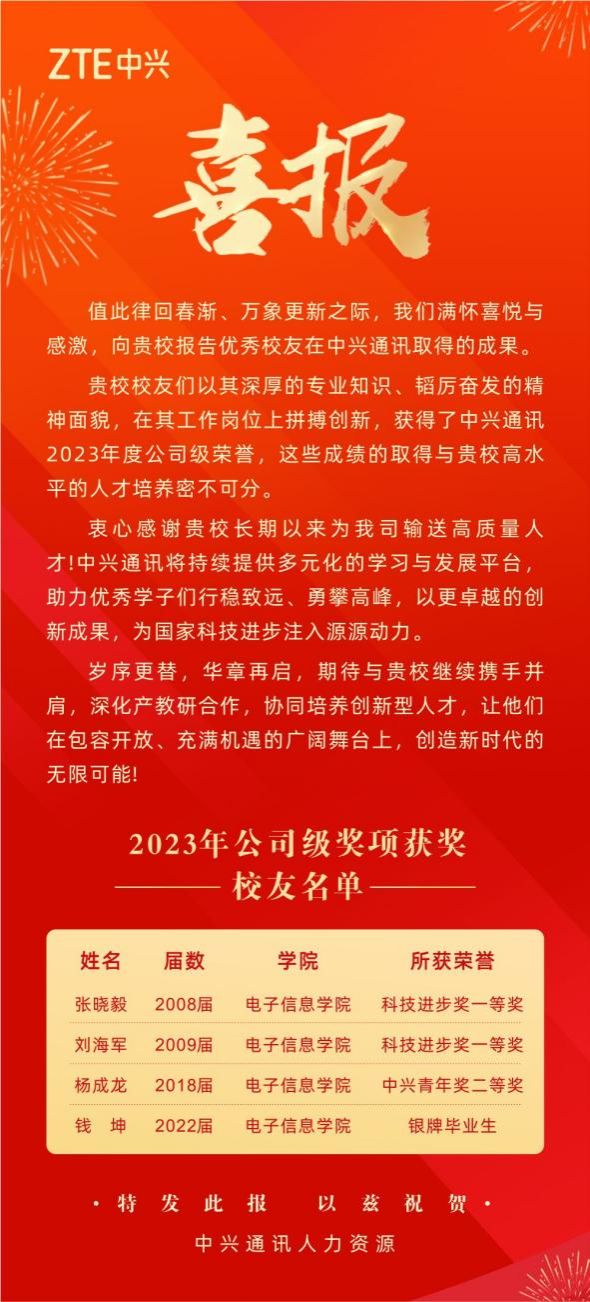 近日,中兴通讯向我校发来喜报,共有16名校友获得中兴通讯2023年度公司级荣誉,其中有4名校友毕业于电子信息学院。