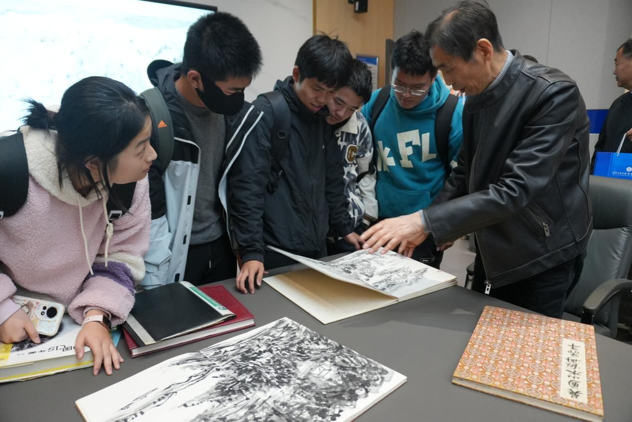 一幅幅泼墨山水画的展开,吴勇带同学们一起感受书画的艺术魅力。书画之道,源远流长,吴勇以自己对书画独特的见解——“阴阳论”,给同学讲解书画艺术的博大精深。以笔墨为媒,传递着东方的哲学思想和水墨的独特魅力。吴勇说“这些作品不仅仅是艺术,更是传承和发扬中华文化,要坚定文化自信,我们是浸润着中国文化长大的”。