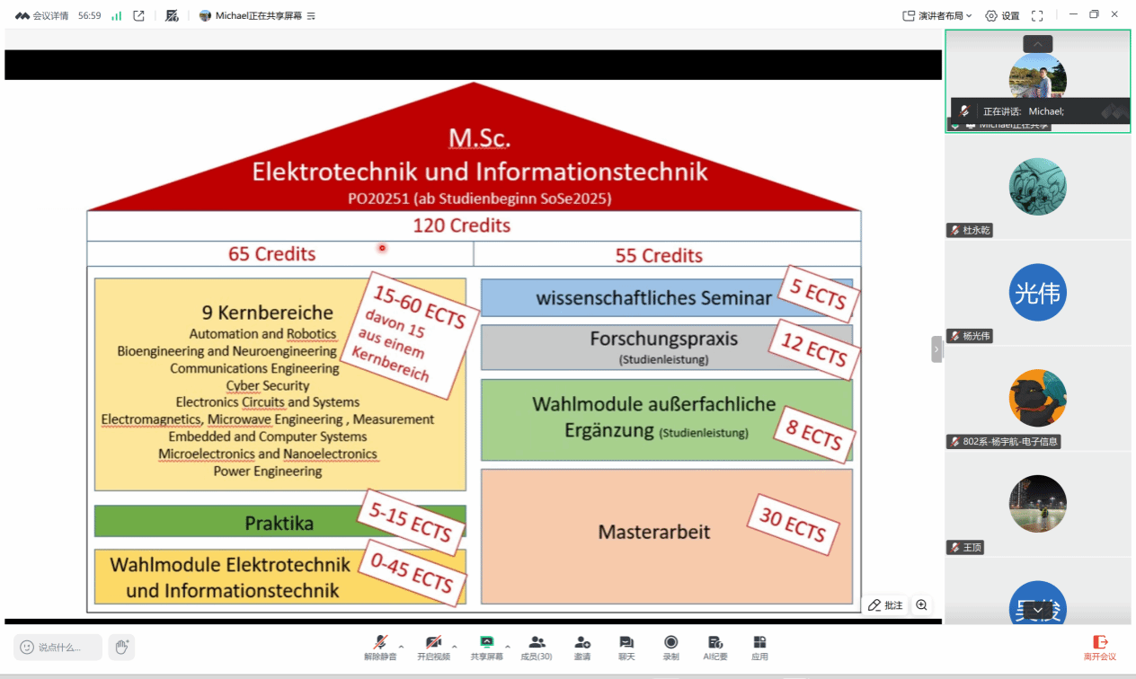 报告中,徐老师系统梳理了德国的教育与科研体系,涵盖高等学校、应用技术大学及科研机构的整体架构,并解析联邦与各州在科研资助中的分工与协作,并深入探讨“在德国谁从事科研、科研如何获得资助、研究生如何被培养”等核心问题。随后,徐老师以慕尼黑工业大学( Technical University of Munich,TUM)电子工程专业为例,具体阐述其硕士阶段的培养目标、课程体系与培养路径。
