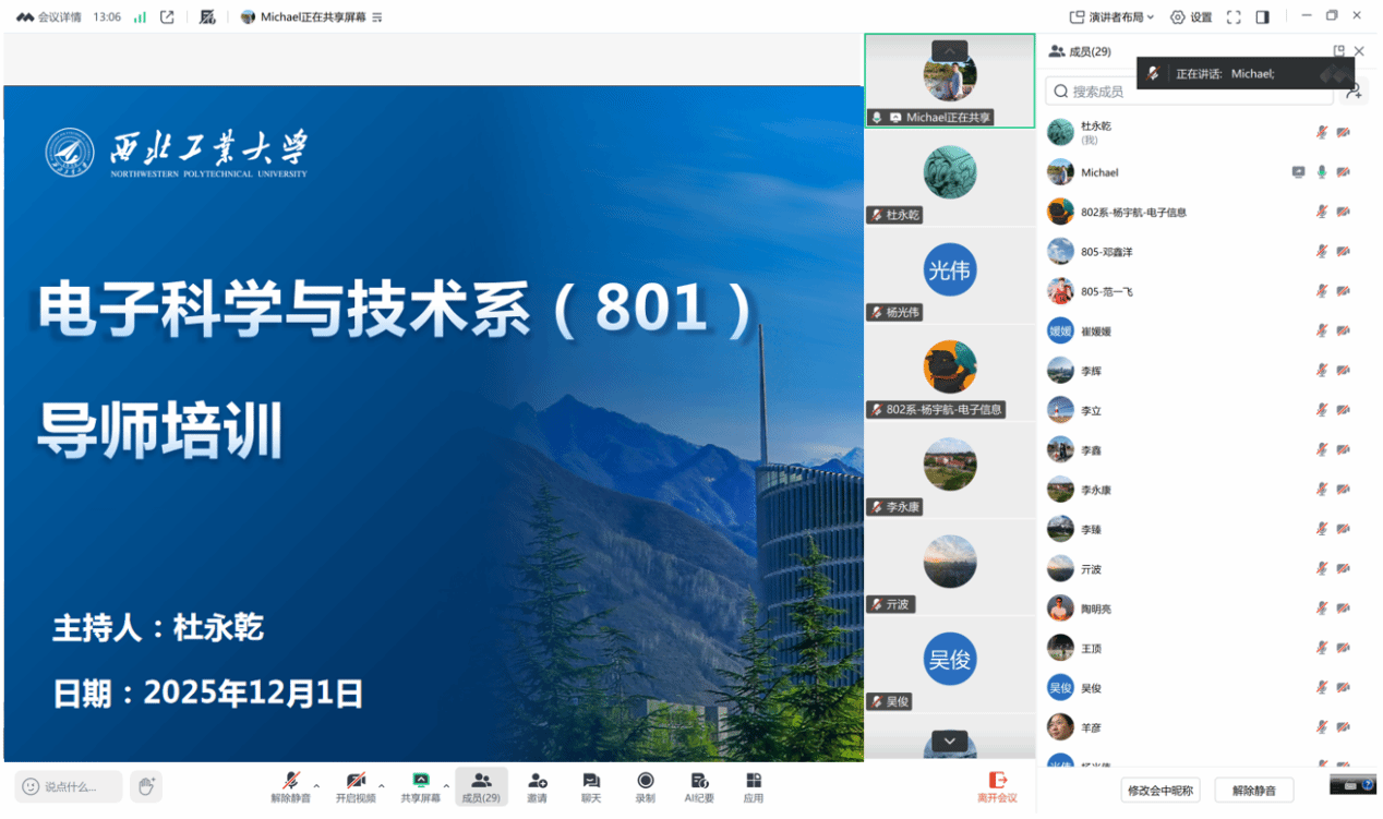全面落实研究生导师立德树人职责,加强研究生导师队伍建设,保证研究生导师培训质量,11月20日,电子信息学院电子科学与技术系(801)研究生导师培训线上交流研讨活动成功举办。本次活动邀请德国慕尼黑工业大学徐鹏程老师,作《国际化研究生培养探索—中德科研及研究生培养体系对比》专题报告。