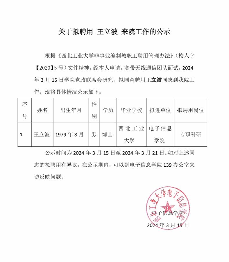 关于拟聘用王立波来院工作的公示