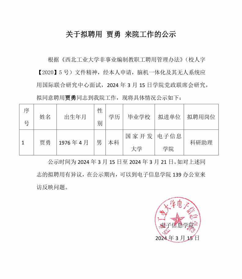 关于拟聘用 贾勇 来院工作的公示