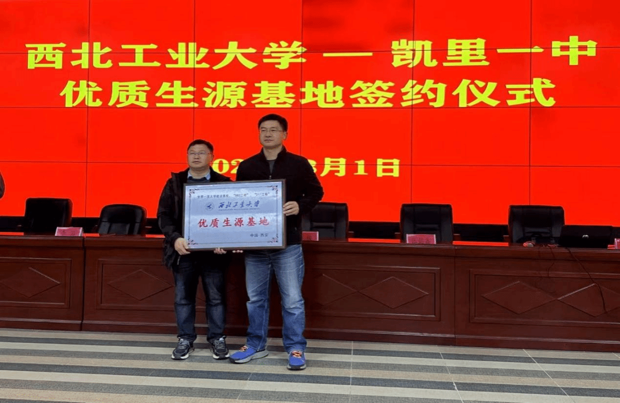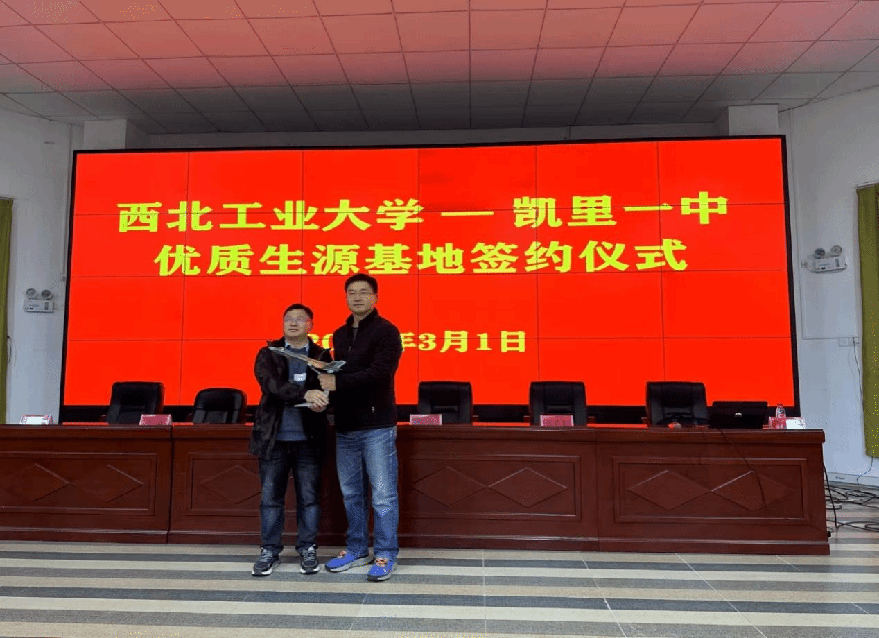 3月1日下午,凯里一中副校长潘启祥、副校长杨海、教务主任刘寅等出席了“优质生源基地”签约授牌仪式。在仪式上,侯俊书记与凯里一中潘启祥副校长签署了西北工业大学-凯里一中“优质生源基地”共建协议,并向凯里一中授牌,同时赠送由我校校友杨伟院士担任型号总师的歼-20战斗机模型和6套由西北工业大学出版社出版的科普图书。签约仪式上,双方围绕生源基地建设、课程建设、人才培养等议题进行了探讨与交流,并表示将以共建优质生源基地为契机,进一步促进西北工业大学与凯里一中两校的交流与发展,不断通过优化资源,积极探索育人新模式,为国家培养更多品学兼优的创新型人才。