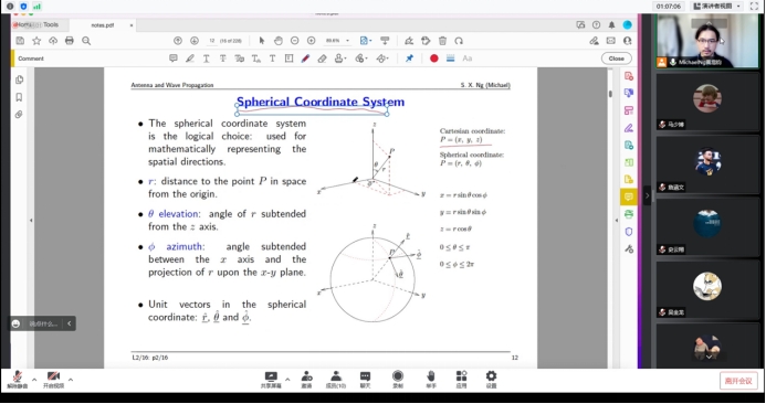 英国南安普顿大学Soon Xin Ng教授全英文在线讲授了《Fundamental of Wireless Communication》(《无线通信基础》),电子信息学院梁微副教授担任助教老师。在课程讲解阶段,Ng教授为了帮助学生系统地学习无线通信的基础理论与实际应用,将授课内容分为6大部分,并在Matlab学习及仿真阶段精心设计教学方案,细心指导学生开展通信问题的仿真验证,对于学生提出的问题进行耐心地解答及演示。课程帮助学生对无线通信的基础知识有了更加深刻的了解,丰富了学生对于Matlab仿真的认知。
